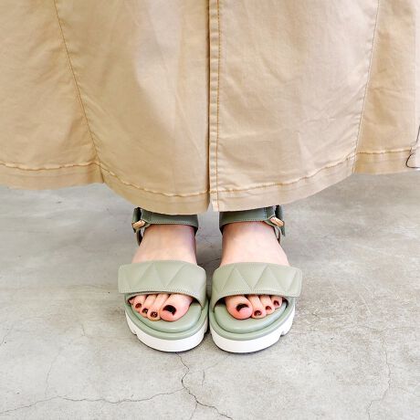 見た目も足あたりもソフトな、やさしめパデットサンダル。面ファスナーで自分サイズにアジャストでき、ストレスのない履き心地です。
