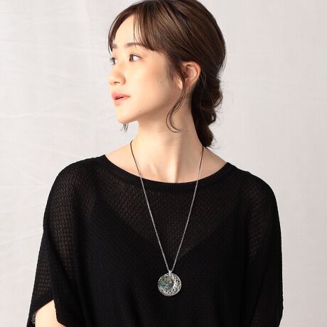 《デザイン》シート状にしたシェルの上にガラスを散らし、樹脂でコーティングした美しい素材です。シェルの光沢が、とても美しい銀河の世界を表現しています。ガラスの輝きを天の川の輝きに見立て散りばめました。そんな夜空を繊細でエキゾチックな三日月が、ふんわり覆っています。首にあたる部分は紐になっています。肌に優しいデザインです。とても軽くストレスを感じずお楽しみ頂けます。[型番:80-86AH05-204]