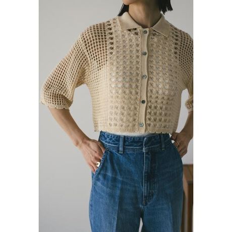 BLK,PNK:モデル身長163cm(FREEサイズ着用)BEG:モデル身長168cm(FREEサイズ着用)立体感のあるドライタッチの糸で編みたてた存在感のあるショート丈ニットシャツ。程よい透け感でインナーにキャミやタンクをレイヤードして着用頂くのがおすすめです。透け感あり、ストレッチあり。【お手入れ方法】手洗い可