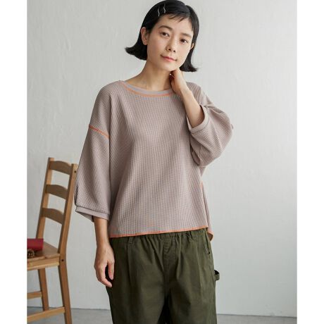 配色ステッチを施したワッフル生地の5分袖プルオーバー。