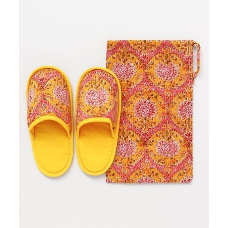 [型番:IAWP33A1-2024]収納ポーチ付きスリッパ。柔らかく持ち運びに便利。旅行のお共にも。インド伝統技法のブロックプリント風に草花を繊細な色で表現。スリット糸入り。