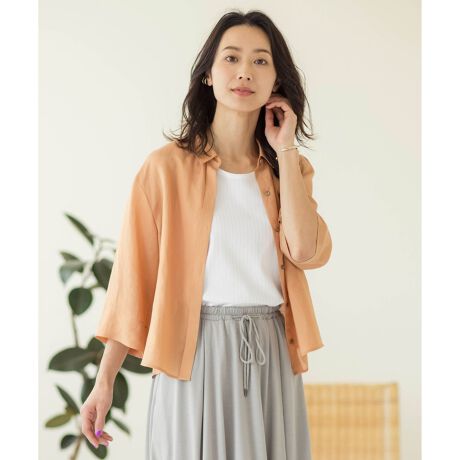 クロップド丈でトレンド感を演出するブラウス。裾に向かってストンと落ちる、ボクシーなシルエットがコーディネートに鮮度をプラスしてくれます。ゆったりとしたオーバーサイズと、肘が隠れる安心感のある袖丈がポイントです。前後差のあるヘムラインが、体型カバーしつつスタイルアップしてくれます。ワイドパンツやロングスカートなど、ボリューム感のあるボトムスとも相性抜群。前を開けて羽織感覚でも着用いただける、1枚あると重宝するアイテムです。カラーは、華やかなアクセントになるオレンジ(#020)、肌なじみの良いベージュ(#033)、ニュアンスのあるカーキ(#054)の3色で展開します。