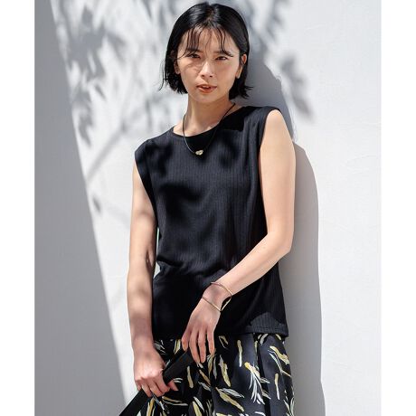 マルチ機能 シアー カーディガンと同じ糸(細番手のレーヨンにポリエステルをカバーリングした糸)を使用しました。ほど良いハリで体に張りつかない設計で作った、インナー用針抜きスムースの素材です。シャリ感をプラスして暑い夏も快適に過ごせるようにした、こだわりの日本素材です。独特のドライタッチ感と光沢感が特徴で、キックバックも良く、しわになりにくい素材に仕上げました。更に加工を加え接触冷感、UVケア効果まで、多機能性を備えています。