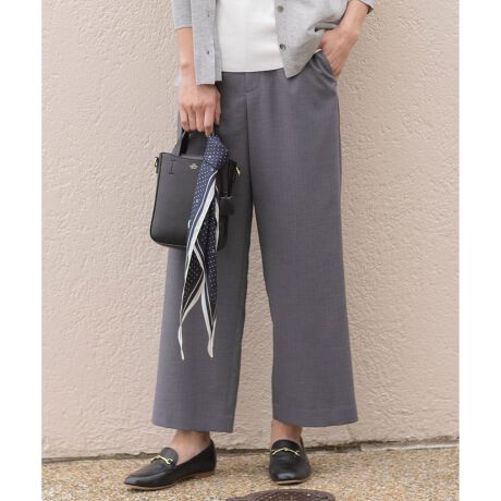 程よいワイドシルエットと後ゴム仕様で、ストレスなく穿いていただけるワイドパンツ。前のウエスト部分に角カン+タブのデザインを入れることで、トップスをインした時のポイントに。洗練された雰囲気のピンストライプ柄でコーディネートを上品に格上げします。すっきりとしたトップスと合わせると、バランス良くきまります。カラーは、知的で落ち着いた印象のグレー(#104)、女性らしさを引き立てるベージュ(#133)の2色展開です。グレー(#104)は裏地無しのため、季節を跨いで長い期間着用いただけます。ベージュ(#133)は総裏ありで、仕立ては膝下20cmです。