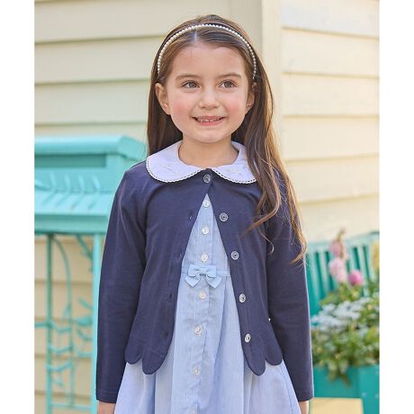 裾スカラップがキュートな、シンプルなカーディガン。長袖ですが、接触冷感加工を施しており肌に触れるとひんやりするので、暑い夏にもぴったり!さらに、UVケア加工付きなので通園通学や外遊びにも大活躍のアイテムです。もちろん肌寒い時の羽織としても着用頂けます。これからの時期に一枚は持っていたい必需品です♪ご自宅の洗濯機で洗えるところも嬉しいポイント。綿100%なのでお子様にも安心です。