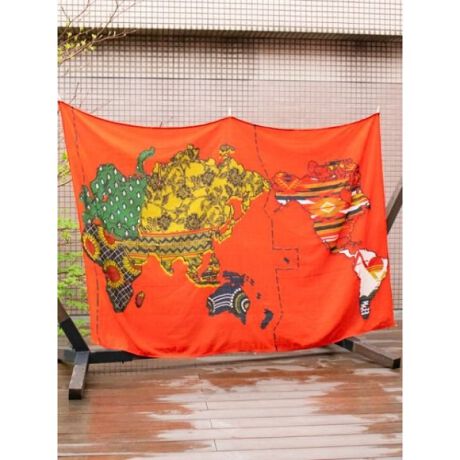 世界を背に寝る気分は最高。大胆なカラーリングの世界地図がデザインされたマルチクロス。ベッドやソファーに掛けたり、フックをつけてカーテンになどにしても。6つのループが付いているので、キャンプなどのアウトドアの場面でも大活躍。