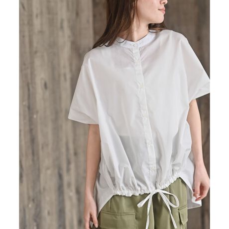 上品なバンドカラーで顔周りをすっきりさせた大人カジュアルな1枚。