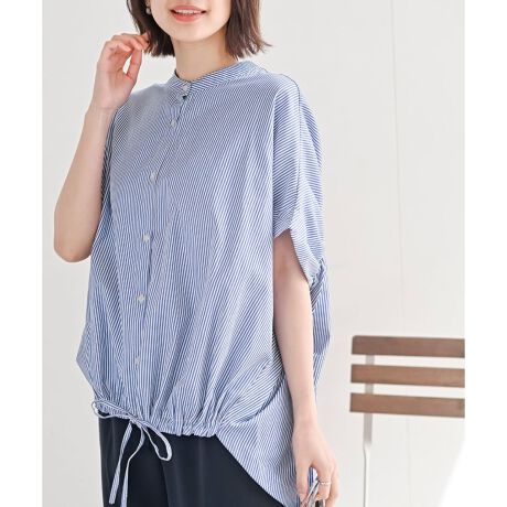 バンドカラーギャザーオーバーワイドブラウス