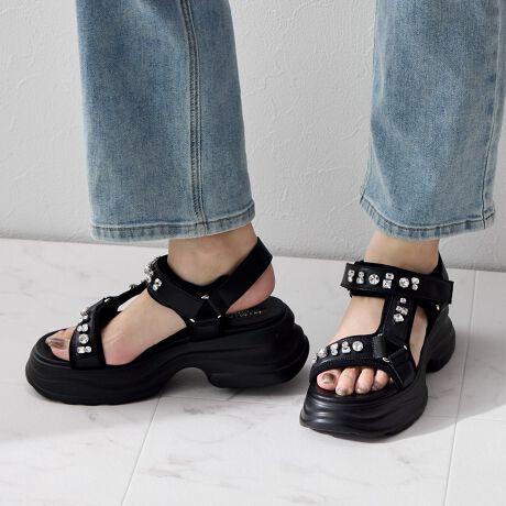 軽量で歩きやすい厚底ソールに、ベルトは存在感のあるキラキラビジューを配置し足元に華やぎをプラス。