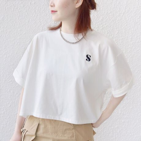 クロップド丈のワイドな身幅のショート丈Tシャツ。緩やかなドルマンスリーブです。