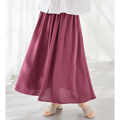 たっぷりのギャザー入りで、ふわっと広がるリネン風スカート。足元まで隠れるマキシ丈だから、気になる脚のラインも自然にカバーしてくれる。