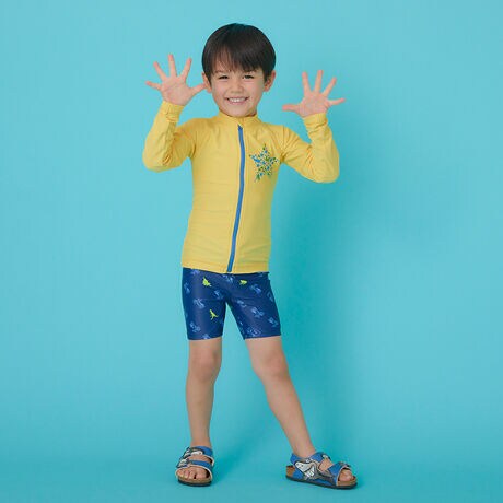 デリケート肌のお子さんの紫外線対策に持っておくと便利なラッシュガード。たくさんの動物で表現したスターのグラフィックが映える1着☆