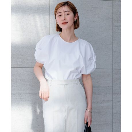 袖口をツイストしたドルマンカットソー。袖口は締め付けすぎないので、サラッと涼しく着こなすことができます。袖の立体感と襟ぐりのミニマルなクルーネックが大人らしさに加え、程よいモード感もプラスします。スカートに合わせても甘くなり過ぎないので、キレイ目にもスタイリングできるデザインです。カラーは、着合わせしやすいホワイト(#001)、肌なじみの良いベージュ(#033)、ニュアンスのあるカーキ(#054)、定番のブラック(#054)の4色展開です。