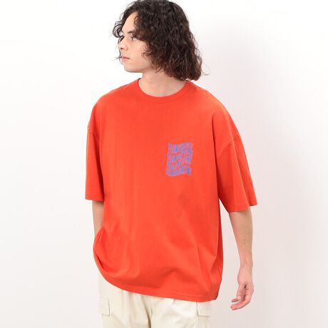 左胸とバックに大きさを変えた同じ波柄のメッセージプリントを入れた半袖Tシャツです。