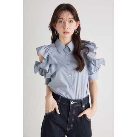 【フリルデザインが目を惹く大人フェミニンなブラウストップ】【Design】肩開きのショルダーフリルがポイントのフェミニンなブラウスです。抜け感を出すためにフリルの中心を切り抜いたようなディテールに拘り、360度どの角度から見ても立体的に見える仕様であったり、フリルのボリュームをもたせるようにギャザーをたっぷり施し可愛らしい印象に仕上げました。また、後ろ身頃には細い共紐でのレースアップデザインを取り入れ、よりフェミニンさに近づけました。身頃はコンパクトのサイジングなので様々なボトムスにマッチし、コーディネートの幅が広がります。【Color】どんなボトムスにも合わせやすい爽やかで万能なWHTと、きれいめからカジュアルにも落とし込めるBLK、トレンドカラーとなる新鮮なBLUの3色展開です。■透け感:白のみややり■光沢感:なし■伸縮性:なし■裏地:なし