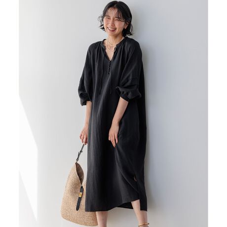 ゆったりとしたボリュームデザインが魅力のカフタンロングワンピース。人気の清涼感のあるリネン素材で軽やかに仕上げました。フロントの丸みのあるクルミ釦がアクセントになっています。両裾にスリットを入れることで、ゆったりと1枚で着ていただくのはもちろん、デニムなどボトムスとのレイヤードスタイルも楽しめるデザインです。大人カジュアルにこなれ感をくれるカーキ(#054)、暑い時期にもシックに見せるブラック(#005)、爽やかな中にも都会的な印象のあるベージュxホワイトストライプ(#233)の3色展開です。