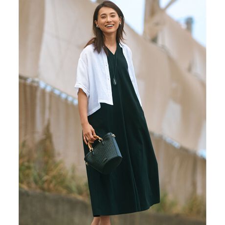 ノースリーブのジャージー素材ワンピース。Vネックの刻みの部分から裾に向かってフレアのシルエットが出ることで、体のラインを拾いにくく程よいモード感がプラスされたシルエットに。スリーブレスですが、袖ぐりのカーブを緩めに取ることで腕周りの印象をすっきりと見せてくれるデザインです。カラーはベーシックなブラック(#005)、カジュアルに着こなせるカーキ(#054)、春夏らしい鮮やかなブルー(#074)に、ご好評によりナチュラルな優しい雰囲気が魅力の【WEB限定】ライトグレー(#003)が加わり、全4色展開です。