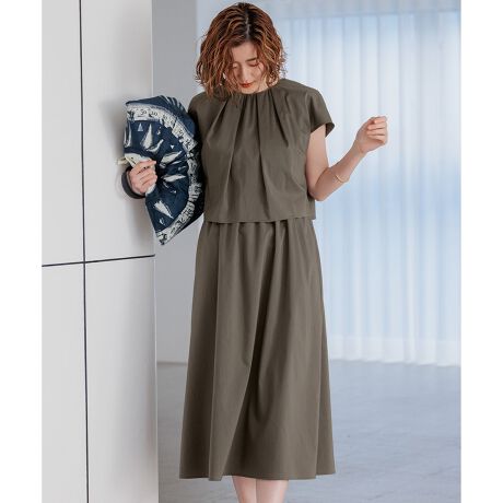 クルーネックの半袖トップスをあわせたようなデザインのワンピース。胸元にタックをあしらうことで程よく洒落感とゆとりをもたせながら、スカート部分はフレア分量を抑えてストレートラインにすることで全体的にすっきりとまとまるシルエットです。トップスレイヤードデザインに加えて、やや高めのウエスト位置にゴムギャザーを入れることで、着心地よくスタイルアップが叶います。きちんと見せつつもリラクシーな着用感が魅力のデザインです。ご家庭で手洗い可能なのもうれしいポイント。カラーは暑い時期にも品よく映えるアニスグリーン(#043)、大人カジュアルにこなれ感をくれるモカ(#030)、オンオフ着回しやすいネイビー(#075)の3色展開です。