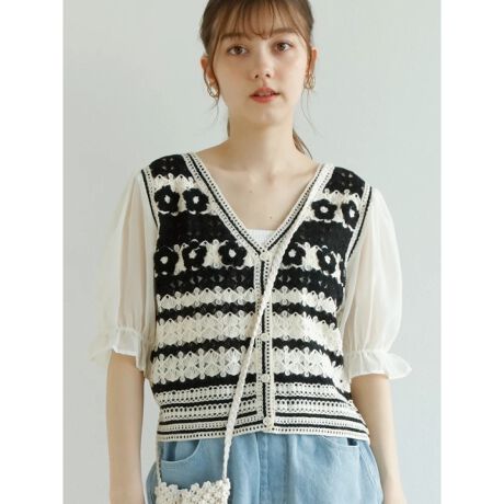 花柄のかぎ針編みで愛らしい印象に仕上げたトップス。