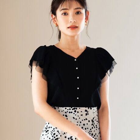 フリル袖がかわいいですが、Vネックで甘くなりすぎず会社にも着ていけます。