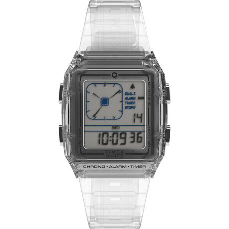 「Q LCA Transparent」は1980年代初頭に発売されたデジタル表示とアナログ表示を兼ね備えた「Q TIMEX LCA」をベースに、ノスタルジックながらも新しさを感じるフォルムや機能はそのままに、新たにスタイリッシュな半透明の樹脂素材をケースやストラップに採用しました。