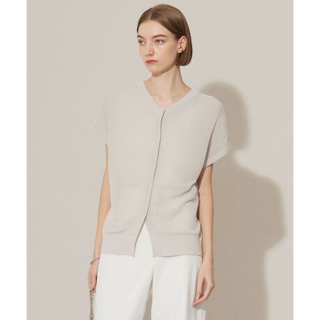 ■デザインゆったりリラクシーな印象のサマーニットです。Vネックとクルーネック両方のネックラインが楽しめる前後着用が可能。釦を外してカーディガンとしても着ていただける3wayで着こなしの幅を広げてくれる1着です。ハイゲージの片畦組織で繊細に丁寧に編立てており、自然な光沢感と上品な透け感がモードで高級感のある印象に。非常に軽く、シワにもなりにくいのも嬉しいポイントです。
