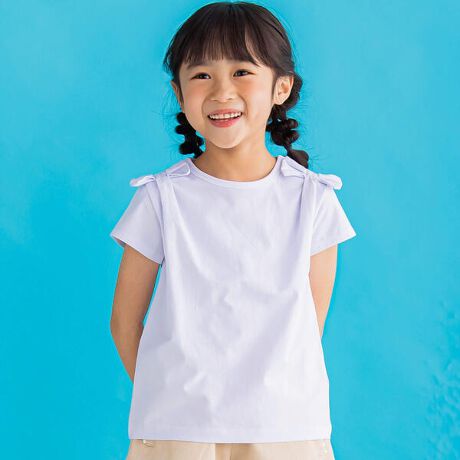 肩に施した大きめリボンがポイントの女の子用半袖Tシャツです。