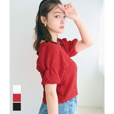 昨年に引き続きトレンドのポップコーンのようなぽこぽこ素材が目を引く一枚。