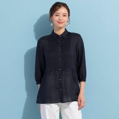 細番手の麻素材を使用した繊細で微光沢感のある素材。適度なハリ感と透け感があり清涼感のある夏のブラウス。