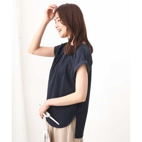 お仕事などにもおすすめなきれいめトップス。フロントはメタルホックパーツでアクセントに。