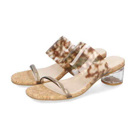 透け感のあるPVC素材にコルク調の中底を組み合わせた、シーズンライクなサンダル。クリアの円柱ヒールでさらに軽さを出し、どんなコーディネートにもはまるマルチアイテム。べっ甲柄を取り入れたブラウン、バイカラーのオレンジやパープルなど見た目も楽しいカラーバリエーション。さっと履けるミュールタイプで、この夏活躍すること間違いなし。