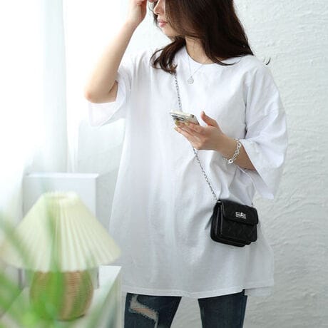 シンプルなのにたった一枚でこなれ感をつくりだすヘビロテ確定のTシャツの登場です。ゆったりシルエットで体型を拾わず、二の腕をカバーする長めの袖丈でカバー力も抜群です。サイドに入ったスリットで動きやすく抜け感も◎ゆるっとしたサイズ感でこなれ感も漂います。シンプルなので合わせるボトムも選ばずコーデが楽しめます。カラバリで欲しくなるおすすの1枚です。