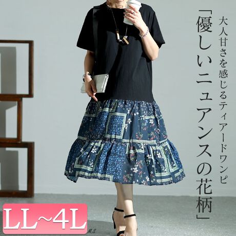 【大きいサイズ】 花柄切替えティアードワンピース 大きいサイズ レディース ワンピース ロング 半袖