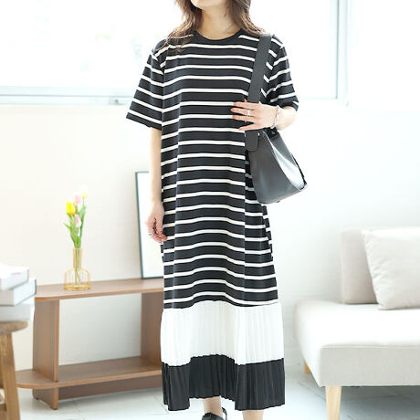 裾がプリーツに切り替わったロングワンピースの登場です。身頃がボーダーと無地の2つのデザイン展開でとってもお洒落。歩くたびに揺れ動くプリーツが全方位きれい見せ。身頃は伸縮性のある生地でカジュアル感もあり気負わず着れます。デイリーやルームウェアなど様々なシーンで活躍してくれます☆