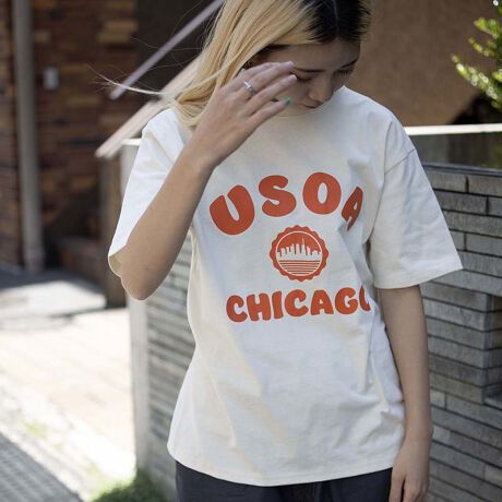 フロントに『CHICAGO』のロゴと湖やビルのデザインが施されたスーベニア(お土産)風Tシャツ。