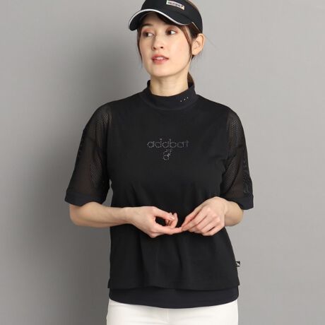 モックネックノースリーブとメッシュの半袖ベストをレイヤード風にデザインした半袖プルオーバーです。