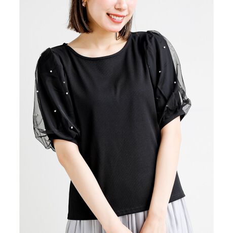 袖にちりばめたパールが上品な華やかさを演出するトップス。