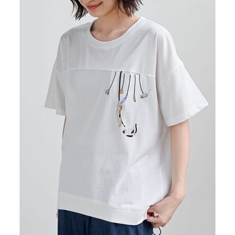 胸元で猫ちゃんがぶらぶらと揺れる遊び心溢れるトップス。