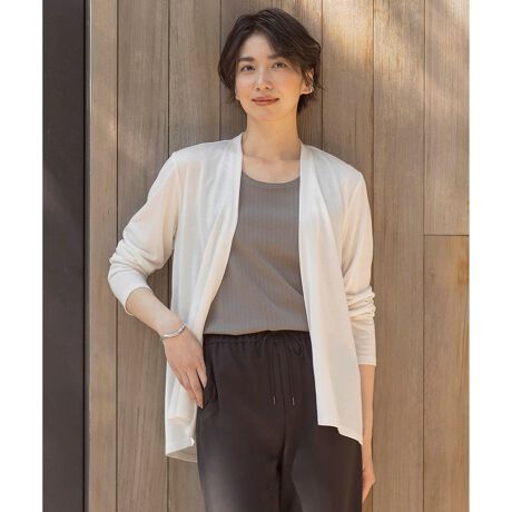 低めの襟で他のアイテムとも合わせやすい、シンプルな着流しカーディガン。パンツにもスカートにも合わせやすい着丈で、汎用性の高いシルエットに仕上げました。暑い季節に袖をたくしあげても良いように、袖口も調整しています。さっと羽織りやすいボタンレス仕様で、手軽にスタイリングできるのも魅力。丈に前後差をつけているため、スタイルアップ効果が期待できます。カラーは、明るく柔らかな印象のライトグレー(#003)、肌なじみの良いベージュ(#033)、爽やかなアクセントになるサックスブルー(#073)、洗練された雰囲気のダルブルー(#074)、ベーシックなネイビー(#075)の5色展開です。