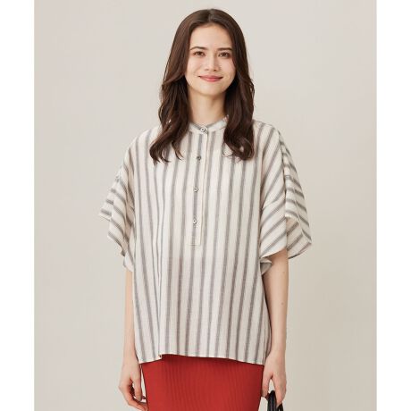 旅行や日常にも映えるフェミニンブラウス■デザインしなやかな表情と素材の落ち感を生かしたスキッパーディティールのプルオーバーブラウスです。ドロップした肩から流れるように切り替えたフレアスリーブが1枚で華やかなデザイン。ボディラインを拾いにくいゆとりのあるシルエットで、しなやかな素材ならではのドレープ感が柔らかくフェミニンな印象です。シンプルなボトムと合わせるだけで華やかで涼しげなコーディネートが完成します。無地2色、ストライプ柄2色の計4色展開です。■素材日本の先染め織物産地で有名な兵庫県西脇地方で作られた平織り生地です。テンセルとリネンの特殊な混紡糸が使われており、テンセルのさらっとしたドレープ性の中にリネン独特の表情と光沢感がブレンドされ、両繊維の長所を掛け合わせた素材に仕上がっています。