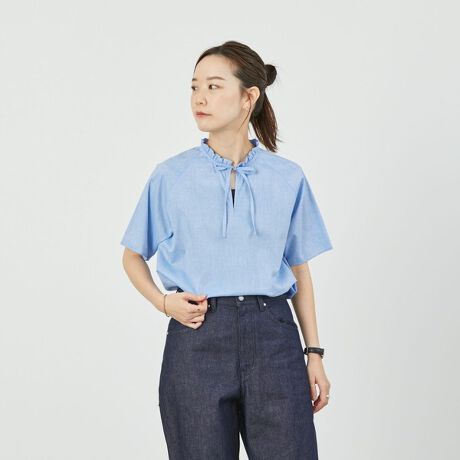 衿元にギャザーの入ったスキッパー半袖ブラウス。衿元のギャザーが素材特有のドレープ感をより引き出してくれます。