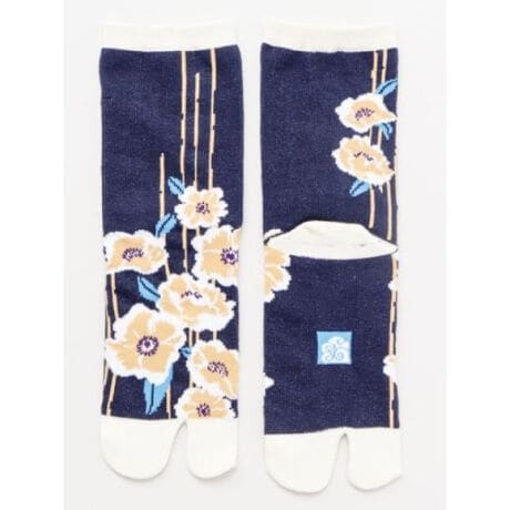 [型番:7JKP0308-2024]奈良県で編み立てた足袋型くつ下。右左のガイド付きで履きやすく、かかと側には日の丸とJAPANの文字を配した遊び心のある設計です。落ち着いた椿柄が装いを上品に引き立てる足袋型くつ下です。