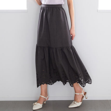 カットレースのような裾のデザインが魅力的なスカート。ギャザー切り替えを施すことで、ふんわりとしたシルエットを演出します。印象の異なるカラーバリエーションにも注目。トップスをタックインしたメリハリのある着こなしがおすすめです。■fabric透け感[やや有り]裏地[一部有り]伸縮性[無し]生地の厚さ[普通]ウエストゴム[有り]ファスナー[有り]ポケット[無し]