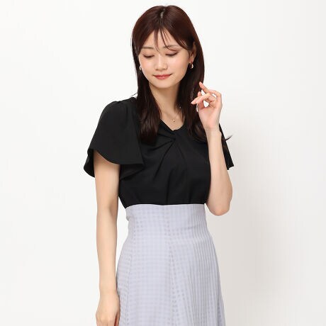 フロントのねじりデザインが表情感をプラスするブラウス。ふんわりとしたスリーブでやわらかな風合いを放ちます。