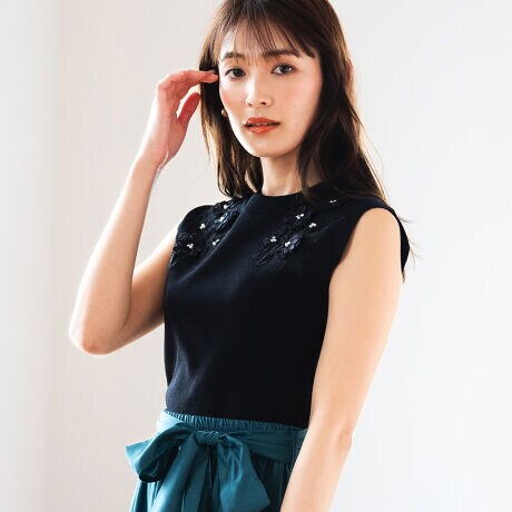 立体感のある3Dフラワーモチーフが可愛らしいニット。ノースリーブのデザインなので、すっきりとした着こなしを楽しめます。どんなスタイリングにも馴染みやすいラウンドネックがポイント。暖かい季節のお出かけに重宝したいアイテムです。■fabric透け感[無し]裏地[無し]伸縮性[有り]生地の厚さ[普通]