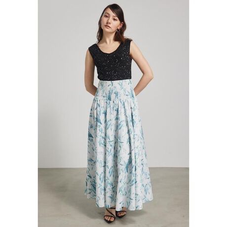 【V&A限定プリントのウエストシャーリングスカート】【Design】昨年も販売して大好評を得たV&A限定プリントのスカートからインスピレーションを得たアイテム。110HS631-0931と同型を使用し、プリント色は土台は落ち着いたアイボリーを使い、葉と葉脈を緩いカーブ状に配置し大人っぽいBLUの濃淡の色使いで表現しました。プリントの色数を最低限に絞り大人っぽく仕上げています。デザインはシンプルですが2通りの着こなしが楽しめる商品です。【Color】落ち着いた色合いの柄WHTです。■透け感:無し■光沢感:無し■伸縮性:無し■裏地:有り