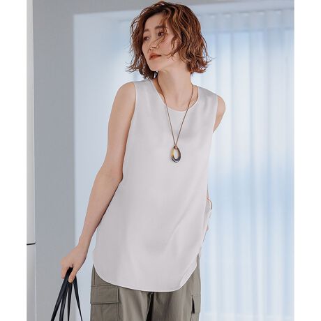 衿ぐり、袖ぐりを4mmのトリミングで始末した、繊細なつくりのタンクトップ。肩幅も下着の紐が見えない安心幅です。袖ぐりのカーブがくりすぎないので、胸の厚みも気になりにくいです。衿ぐりも深すぎないので、上に羽織ったアイテムの前をあけていても上品に着こなせます。裾のシャツテールも繊細な仕立てで、レーシーな編み柄やシアーなトップス、様々なクロップド丈のトップスなど、素材のコントラストを楽しんでいただけます。カジュアルなレイヤードも大人っぽく、上品な着こなしになります。カラーは、上品なアイボリー(#002)、着合わせしやすいライトグレー(#003)、ニュアンスのあるグレー(#004)の3色展開です。