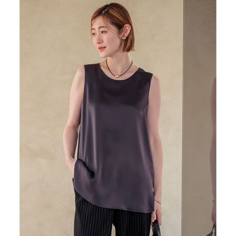 衿ぐり、袖ぐりを4mmのトリミングで始末した、繊細なつくりのタンクトップ。肩幅も下着の紐が見えない安心幅です。袖ぐりのカーブがくりすぎないので、胸の厚みも気になりにくいです。衿ぐりも深すぎないので、上に羽織ったアイテムの前をあけていても上品に着こなせます。裾のシャツテールも繊細な仕立てで、レーシーな編み柄やシアーなトップス、様々なクロップド丈のトップスなど、素材のコントラストを楽しんでいただけます。カジュアルなレイヤードも大人っぽく、上品な着こなしになります。カラーは、上品なアイボリー(#002)、着合わせしやすいライトグレー(#003)、ニュアンスのあるグレー(#004)の3色展開です。