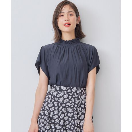 ■デザインスタンドカラーに小さなフリルを付けた前後着用できるデザインで、ややゆったりとしたシルエットのブラウス。ギャザーをたっぷり入れたボリューム感が可愛らしく、袖は肩が隠れる長さでスッキリと着ていただけます。同素材のスカートと合わせてフェミニンにまとめるのはもちろん、デニムと合わせて上品カジュアルにスタイリングするのも◎。同じ素材のボトムとのセットアップでドレス風にみせる華やかスタイリングも素敵です。