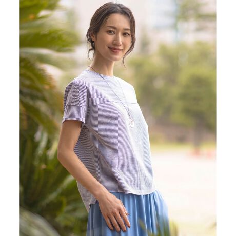 ストライプ生地を前ヨークにはボーダー使い、身頃はストライプ仕様にしてポイントにしたカットソー。二の腕が隠れる長めの裄丈のフレンチスリーブが、涼しげな雰囲気を演出します。裾の脇にスリットを入れた、ボディラインを拾わないシルエットが魅力です。着丈に前後差を出して、パンツにもスカートにも合わせやすく仕上げました。カーディガンのインナーとしてもアクセントになり、1枚着としても活躍する便利アイテムです。カラーは、ベーシックなネイビー(#075)、明るく柔らかな印象のライトグレー(#103)、肌なじみの良いWEB限定のブラウン(#130)、爽やかなアクセントになるブルー(#170)、フェミニンな雰囲気のふじ色(#183)の5色で展開します。
